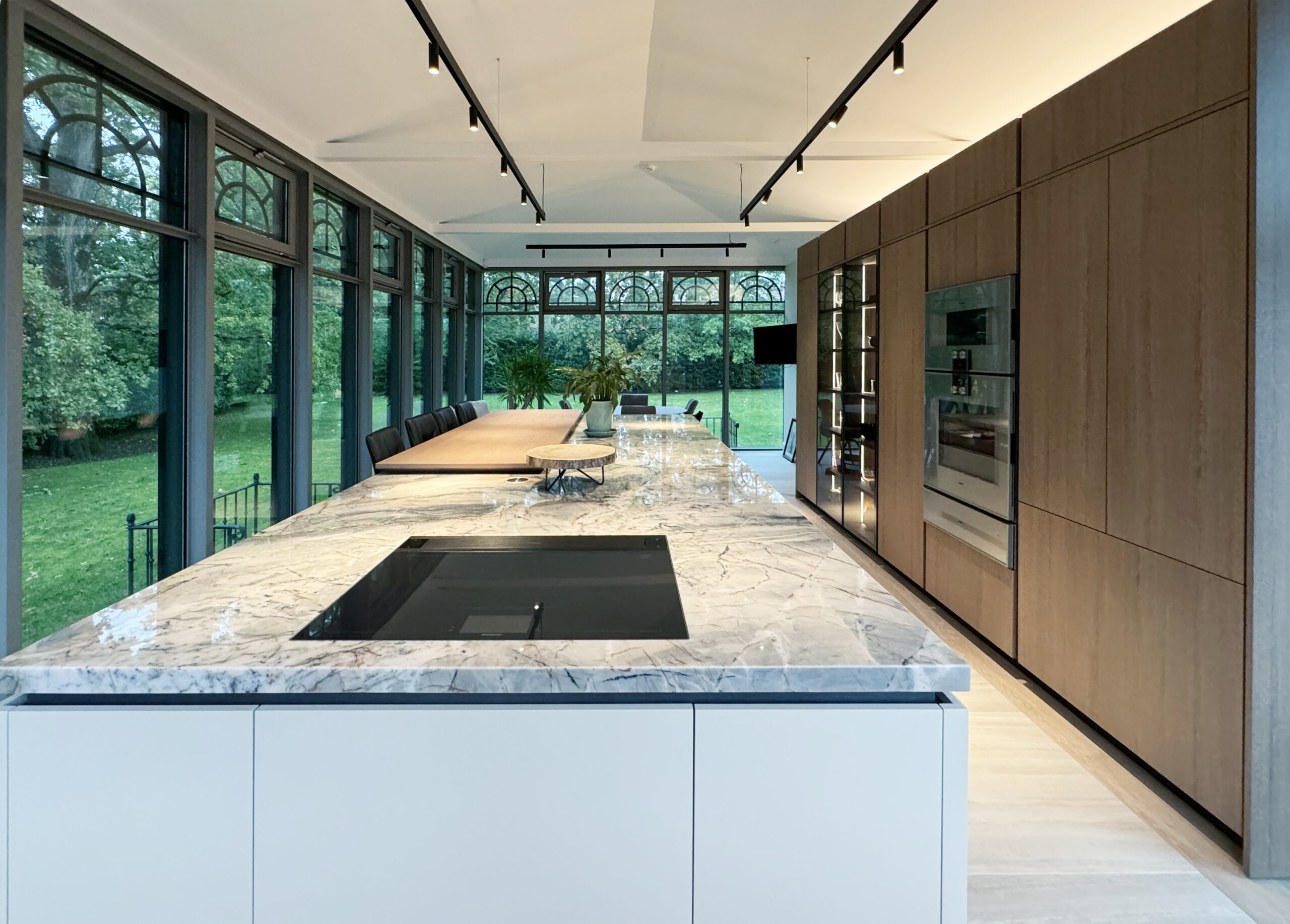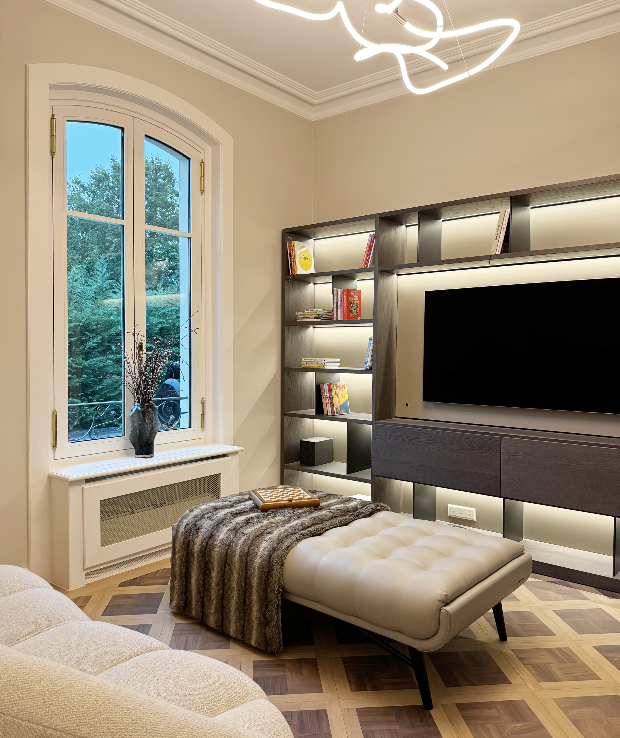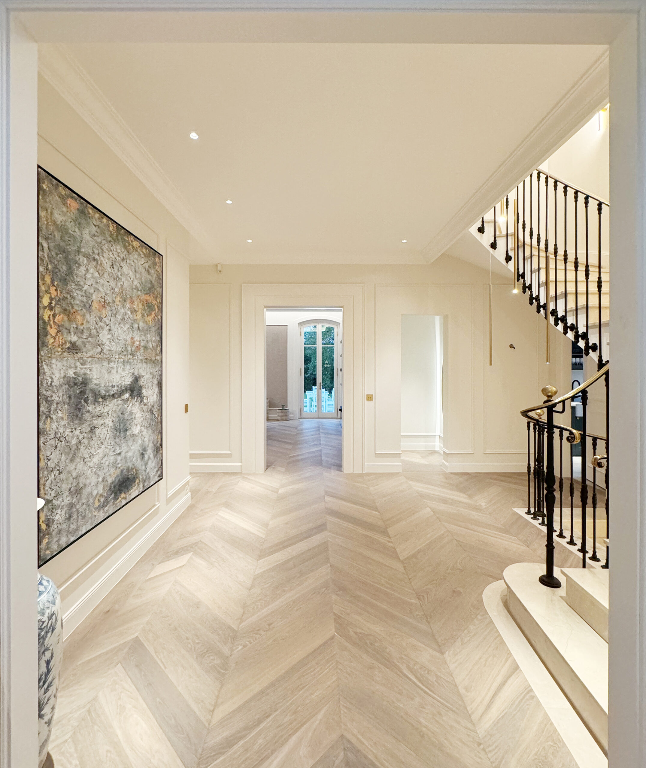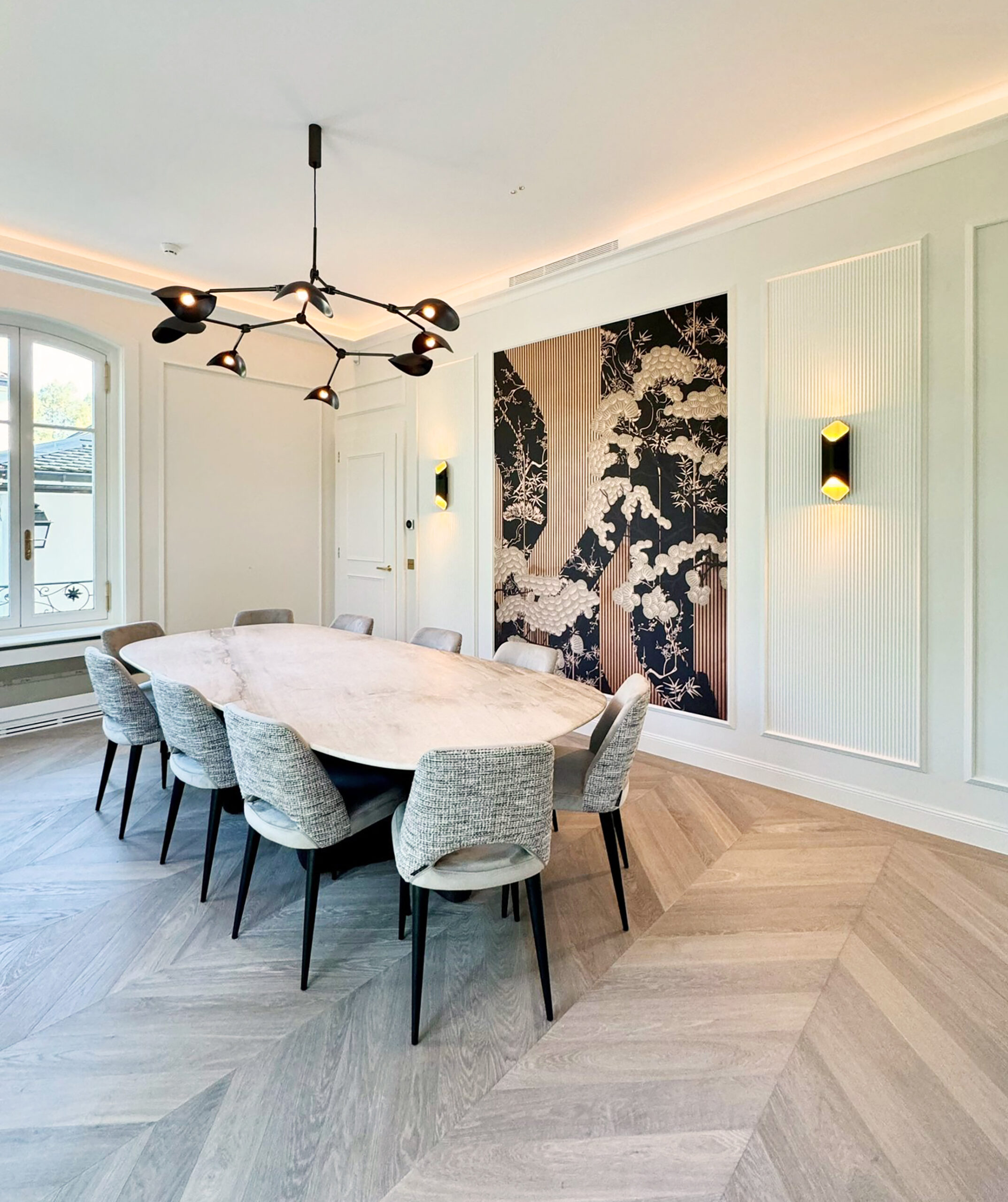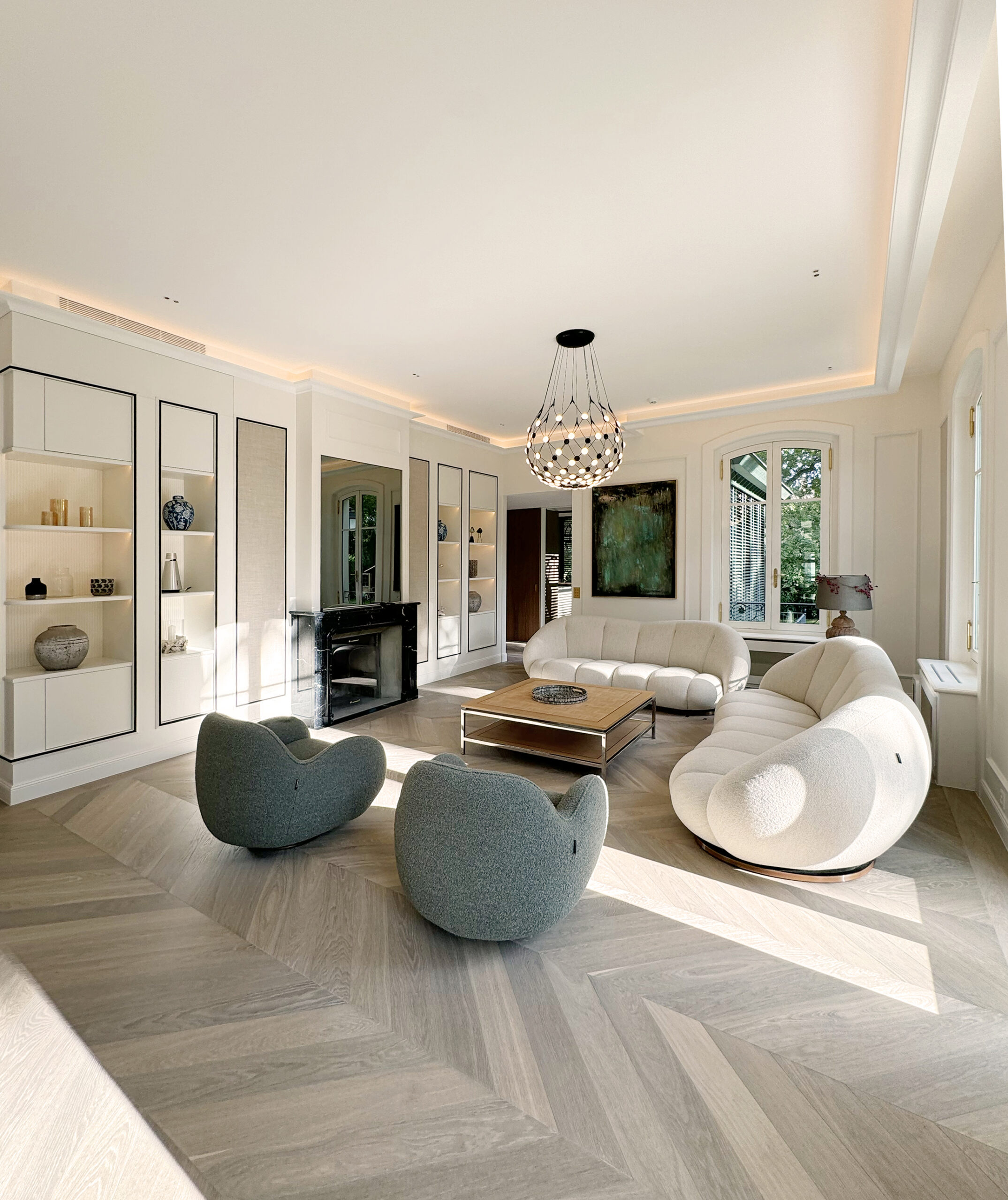 Cette belle villa a fait l’objet d’une transformation complète, avec un remaniement pensé de chaque pièce pour allier confort et élégance. L’aménagement intègre notamment une cuisine dans l’ancien bureau, où le style classique des moulures et corniches se mêle à des touches contemporaines et originales. Chaque espace reflète un équilibre subtil entre raffinement traditionnel et modernité, créant un intérieur harmonieux, chaleureux et plein de caractère.